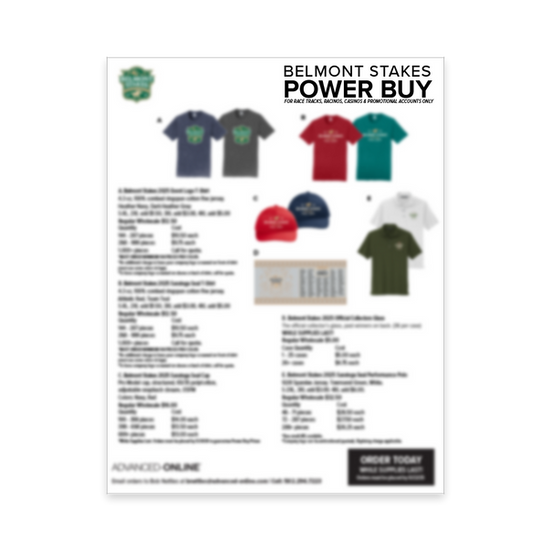 I designed product mockups and a sell sheet for a 2025 Belmont Stakes wholesale assortment of polos, hats, and T-shirts.